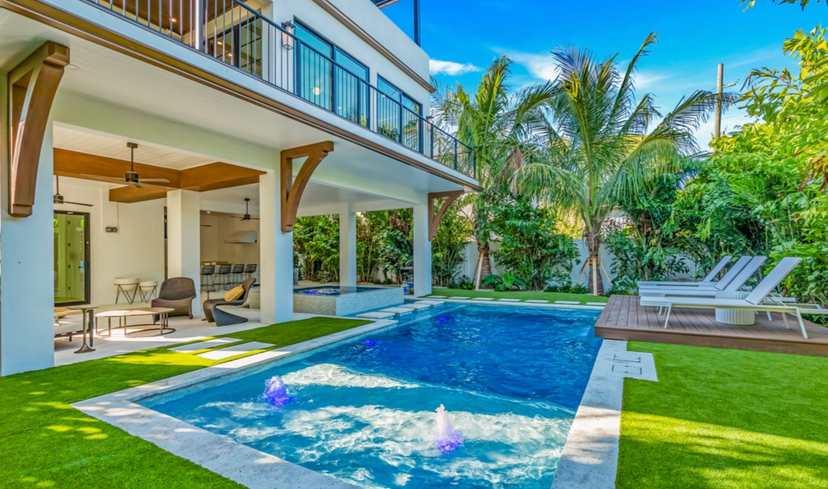 This residence reflects a contemporary coastal aesthetic defined by clean lines, balanced massing, and a light, airy material palette. The façade pairs crisp stucco forms with wide openings and expansive glazing that invite natural light throughout the interior. Subtle wood and metal accents complement the architecture, adding warmth without distracting from the home’s modern simplicity. Multiple balconies and a multilevel rooftop deck extend the living experience upward, creating outdoor rooms oriented toward Gulf views and sunset light. The elevated design enhances resiliency while giving the home a strong, confident presence along the street. Large windows and sliding doors strengthen the connection between indoor and outdoor spaces, encouraging a seamless flow of daily living. Tropical landscaping softens the geometry of the structure, integrating it naturally into its coastal surroundings. The overall result is a refined yet relaxed retreat that embodies the essence of modern island living.